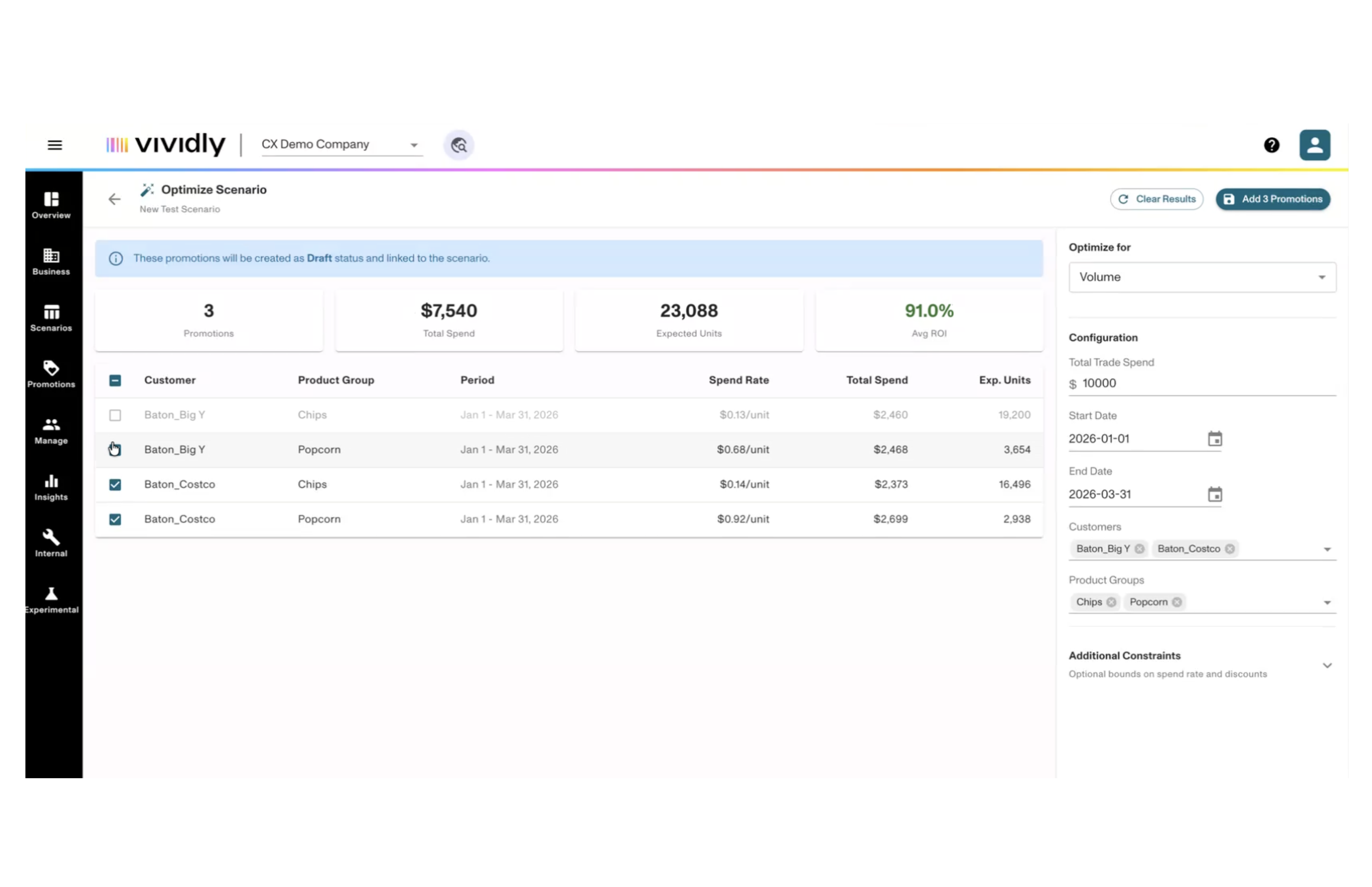 Vividly's AI-powered promotion optimizer generates campaigns that maximize your ROI, volume, or gross margin, within your exact budget and constraints. And when trade spend changes mid-year, replan your entire calendar in seconds instead of days.